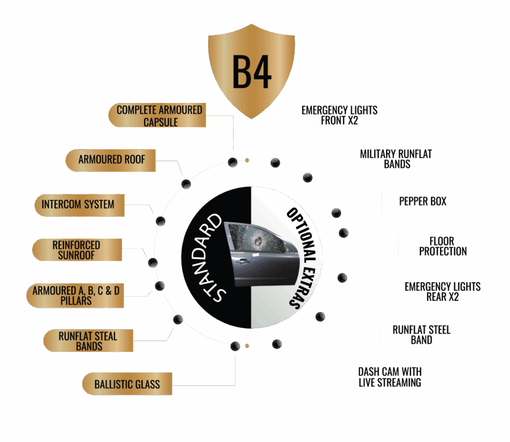 This level of armour is sufficient to protect you from hijackings, smash and grab attempts, as well as from brick/rock throwing. The glass used also provides protection against fragmentation. Level B4 adds approximately 110-140 kg of additional weight because of the premium lightweight armouring materials we use.