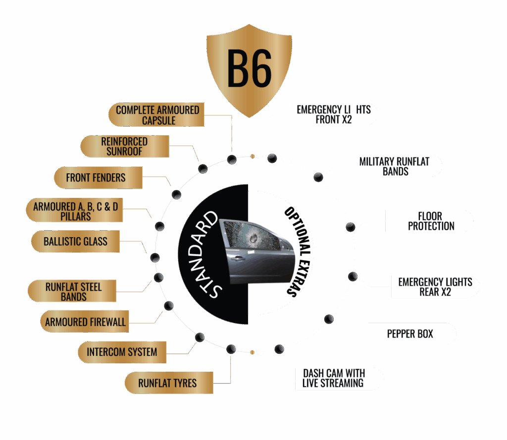 This level of protection will allow you to travel protected into hostile territories. Our Level B6 adds approximately 350-500 kg of additional weight because of the premium lightweight armouring materials we use.