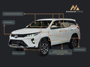 The 2025 Toyota Fortuner 2.8GD-6 4×4 VX armoured by Armoured Mobility is built with B6 Discreet Premium armour, delivering high-end ballistic protection without compromising style. This factory-built armoured vehicle is constructed using superior imported ballistic materials, ensuring complete 360° bullet-resistant protection around the cabin.